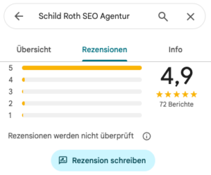 Klicken Sie in der Unternehmenskarte in der linken Spalte nach unten, bis Sie den Bereich „Rezensionen“ sehen. Dort finden Sie den Button „Rezension schreiben“.