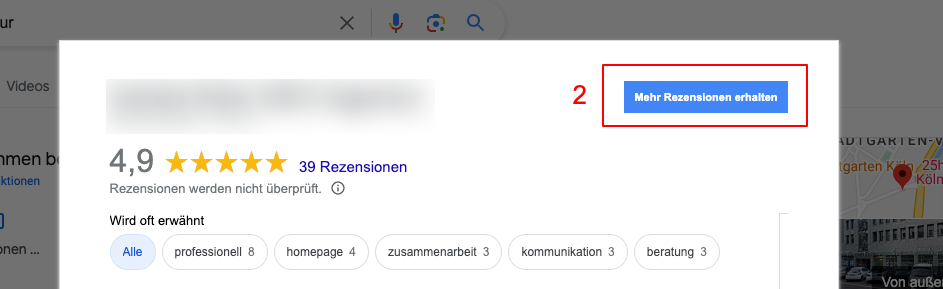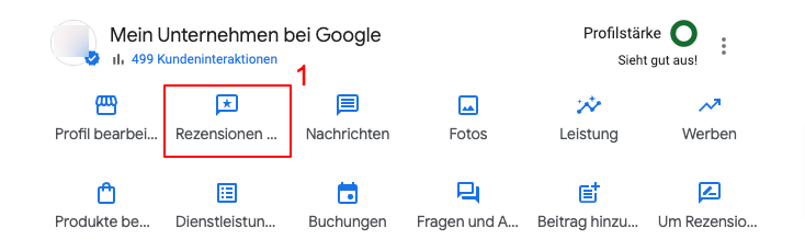 - Dashboard nutzen: Klicken Sie in der Profil-Verwaltung auf den Button „Rezensionen“. Anschließend auf „Um Rezensionen bitten“ (oder „Mehr Bewertungen erhalten“).